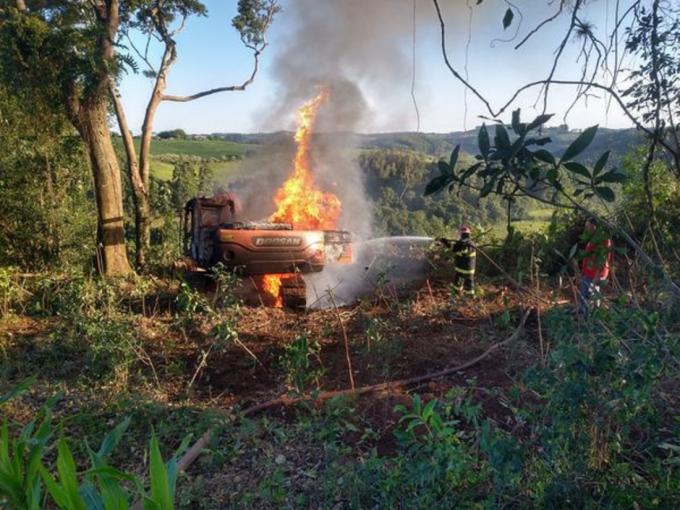 Uma escavadeira foi consumida pelo fogo, no interior de Erval Grande, na tarde desta segunda-feira, dia 07. Segundo os Bombeiros Voluntários de São Valentim e Benjamin Constant do Sul, que atenderam a ocorrência a máquina estava na comunidade de Secção Sete de Setembro.