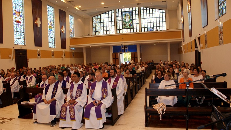 Dom Adimir Antonio Mazali, Bispo diocesano de Erechim, presidiu missa de abertura das comemorações dos 70 anos do Seminário N. Sra. de Fátima, no Santuário do mesmo nome nesta quarta-feira, 1º de março, primeira semana da quaresma. A celebração foi concelebrada por 26 padres e teve a participação de 6 Diáconos permanentes, religiosas e expressivo número de leigos e leigas.
