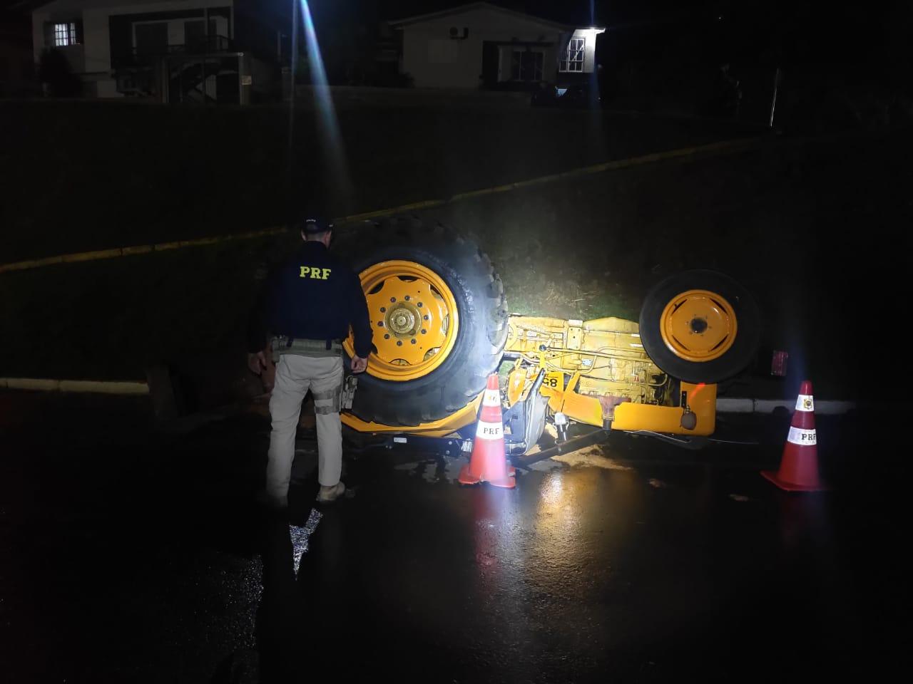 Policiais rodoviários encontraram o trator capotado no acostamento da BR-470, em Barão.