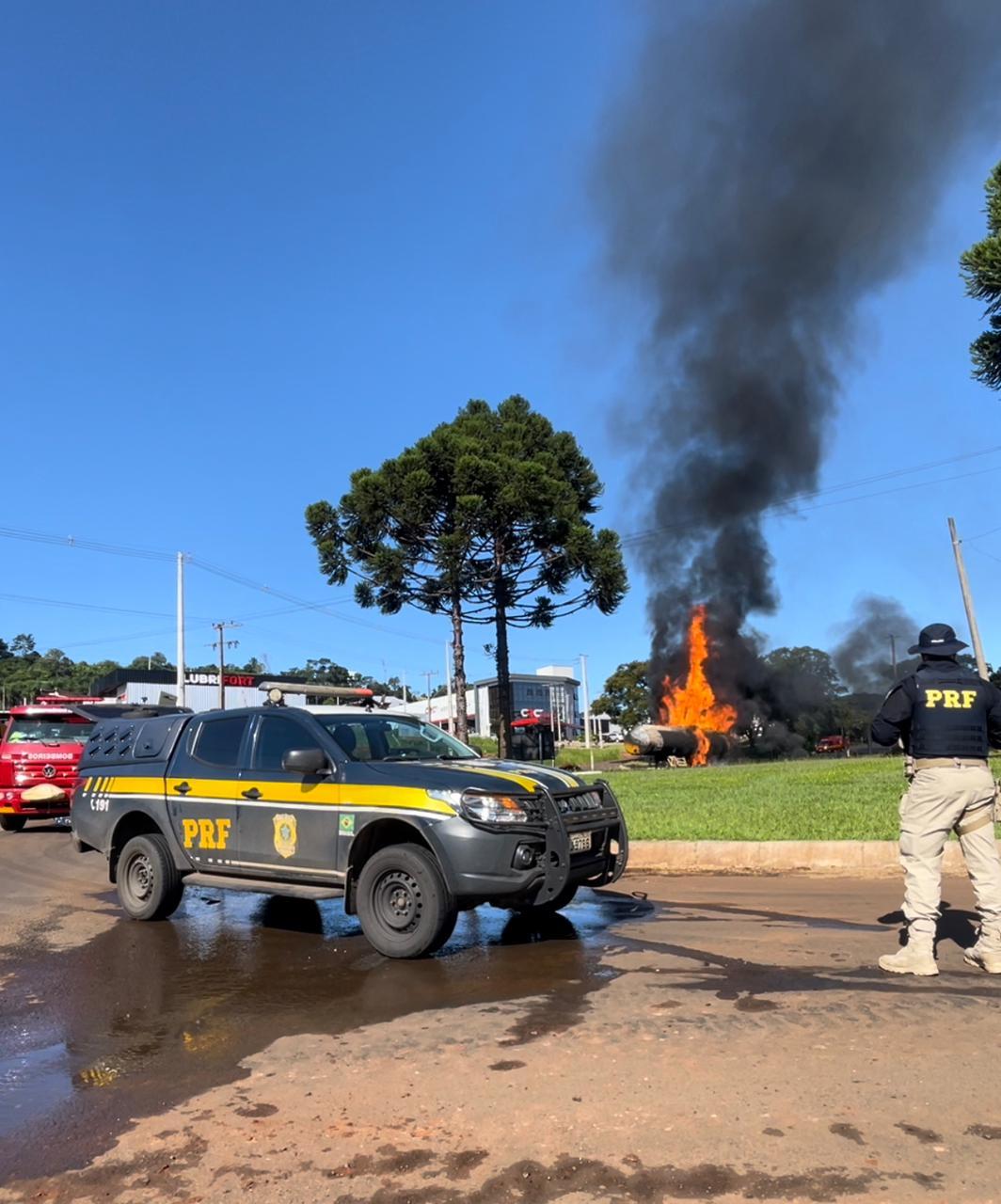 Uma carreta tanque com carga de gasolina foi atingida por um incêndio na tarde de hoje (27), na BR 282, em Pinhalzinho, no Oeste de SC. O fato aconteceu no trevo norte de acesso a cidade, em frente ao quartel do Corpo de Bombeiros.