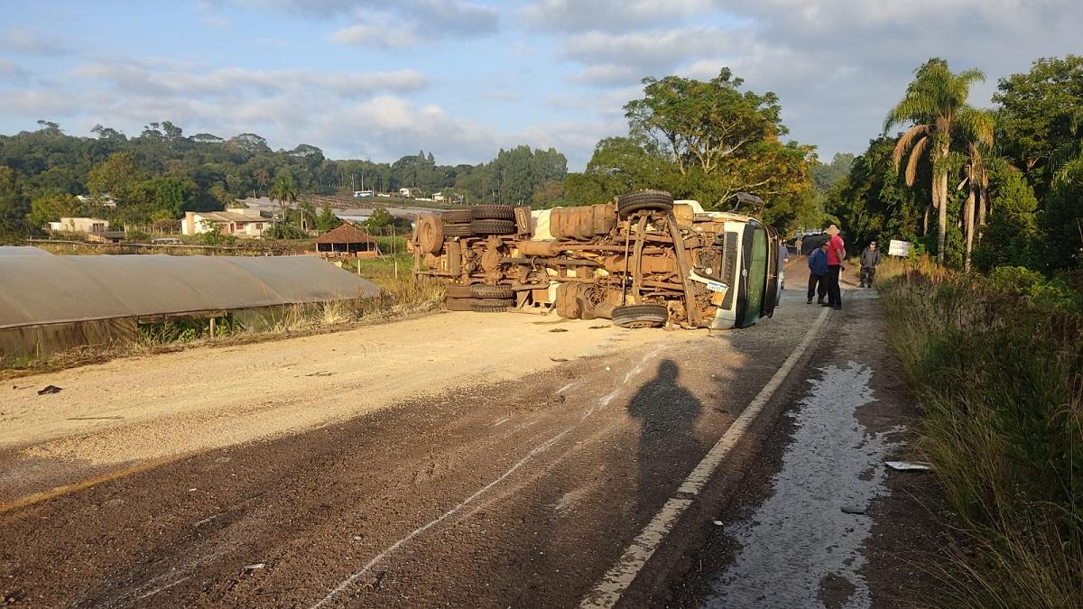 Com o choque entre os dois veículos, o caminhão acabou tombando sobre a pista e o automóvel foi projetado na lavoura, na margem da rodovia.