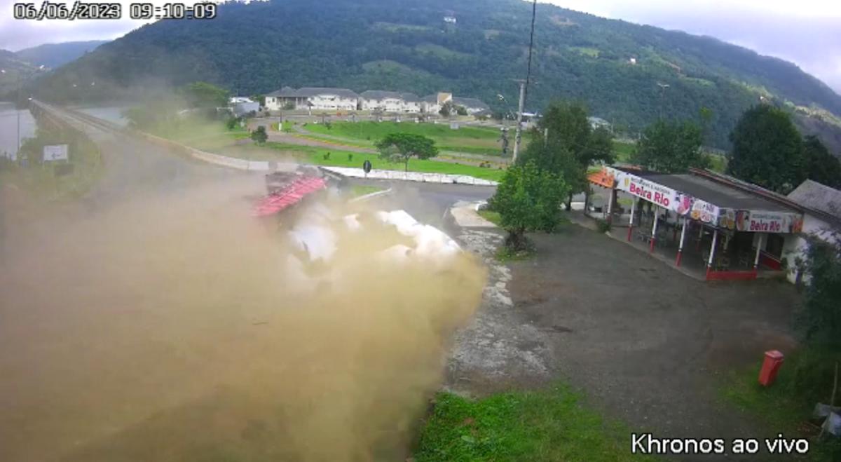 Câmeras de segurança flagraram na manhã desta terça-feira, dia 06, mais um acidente próximo a ponte que faz a divisa do Rio Grande do Sul com Santa Catarina, no Distrito de Goio-Ên.