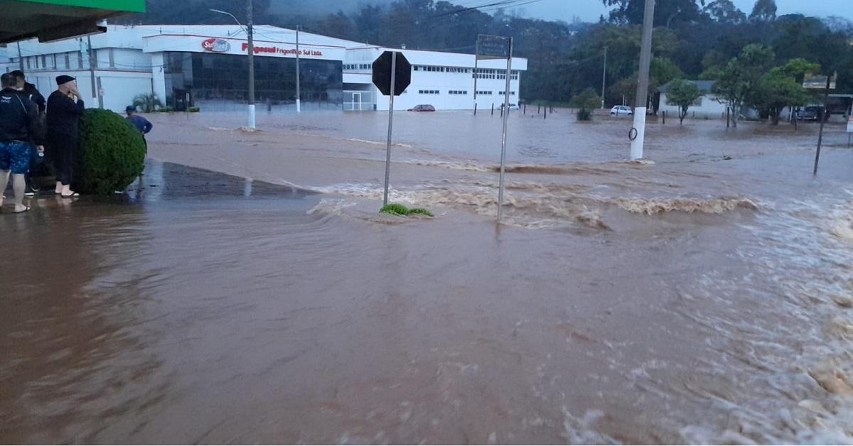 Em Nova Bassano, as águas tomaram conta das ruas na área central da cidade.