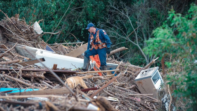 O CBMRS atua nas buscas com 11 cães no Vale do Taquari, realizando um esquema de revezamento. Desse número, seis animais vieram de outros estados.