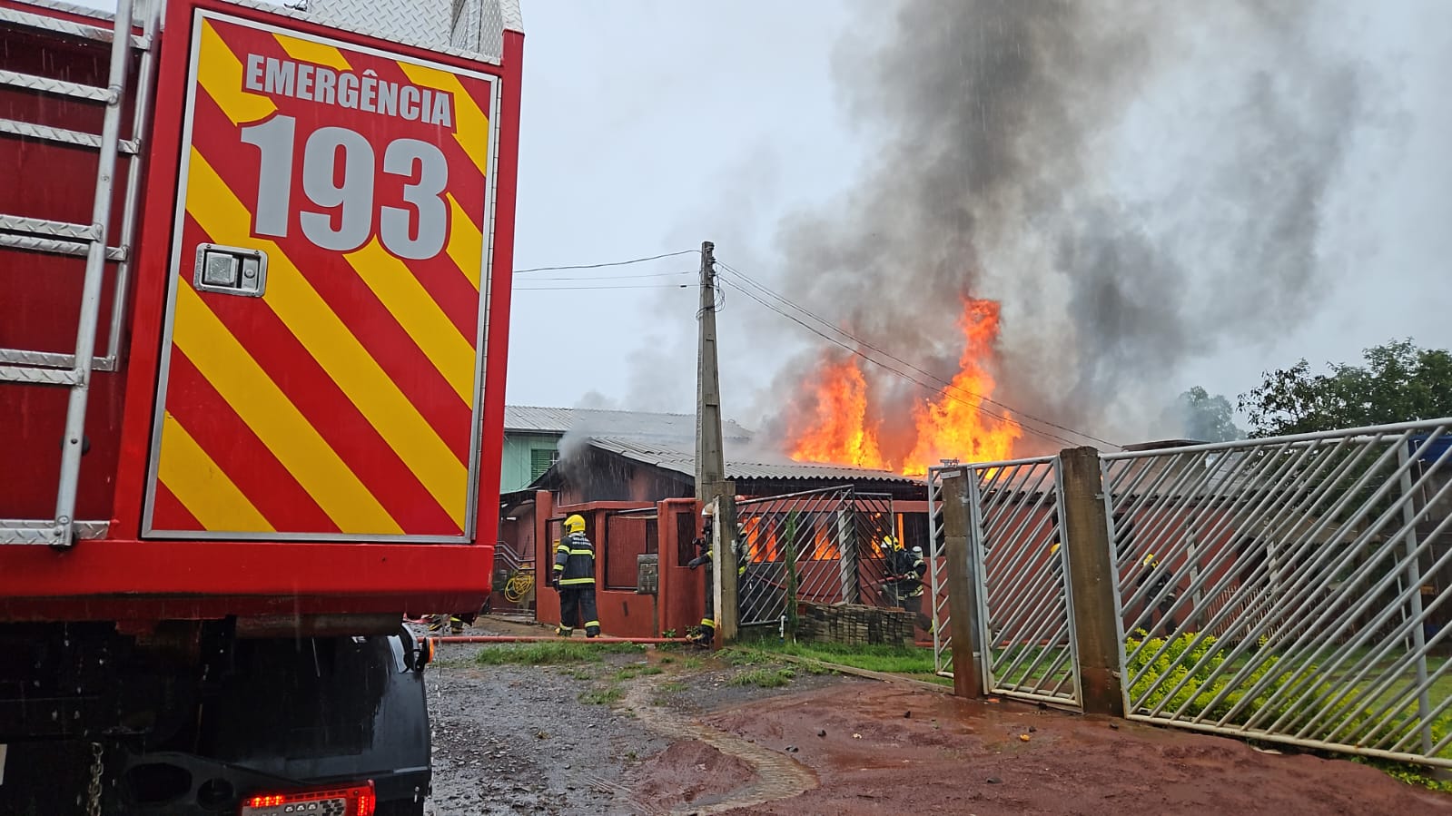 Na manhã desta sexta-feira (03), o Corpo de Bombeiros foi acionado para combater um incêndio de grandes proporções em uma residência, localizada na Rua Nilson Braun, Bairro Vitório Rosa, em Chapecó (SC).
