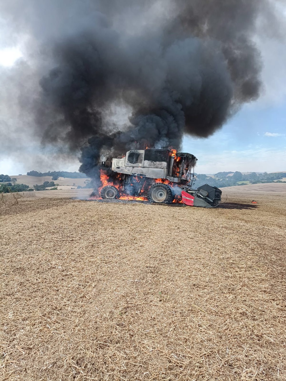 Incêndio em colheitadeira na Linha Barbará, interior de Viadutos, consumiu totalmente a máquina agrícola que trabalhava na colheita de soja.