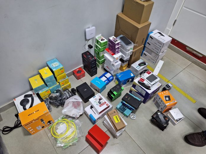 Durante a abordagem, os policiais encontraram dois homens no veículo, transportando uma carga de eletrônicos e medicamentos provenientes do Paraguai. Estimativas indicam que o valor das mercadorias apreendidas ultrapassa R$ 100 mil.