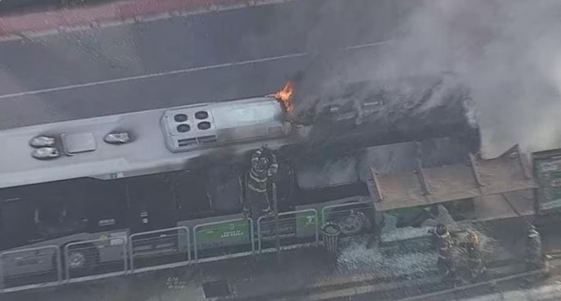 Na queda, a aeronave atingiu um ônibus, que ficou em chamas.