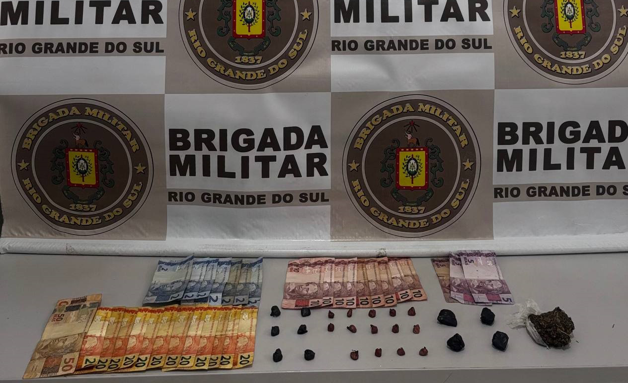 Foi realizado acompanhamento e abordagem, e durante revista pessoal foram localizadas duas porções de cocaína e no pacote R$ 490,00 em dinheiro e uma embalagem mais com 18 porções de cocaína e cinco de maconha.
