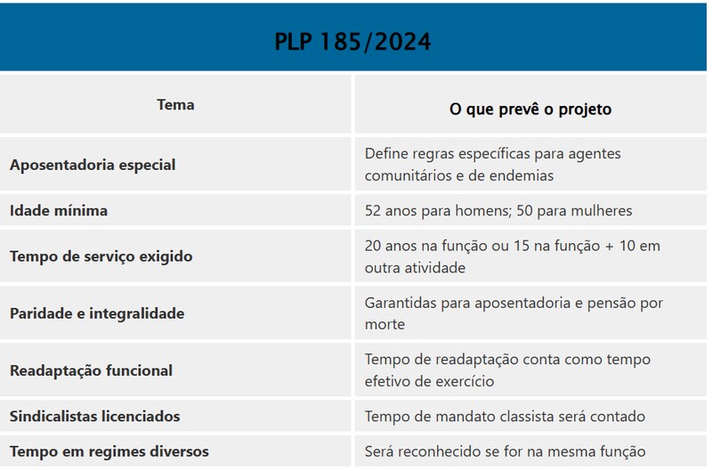 O texto aprovado estabelece que agentes comunitários de saúde e de combate a endemias terão aposentadoria com integralidade e paridade, além de pensão por morte e aposentadoria por incapacidade permanente decorrente do trabalho. Poderão se aposentar aos 52 anos (homens) e 50 anos (mulheres), desde que tenham 20 anos de exercício na função, ou optar pela regra alternativa de 15 anos na atividade + 10 anos em outra ocupação. Estados e municípios deverão ajustar sua legislação em até 120 dias após a publicação da lei.