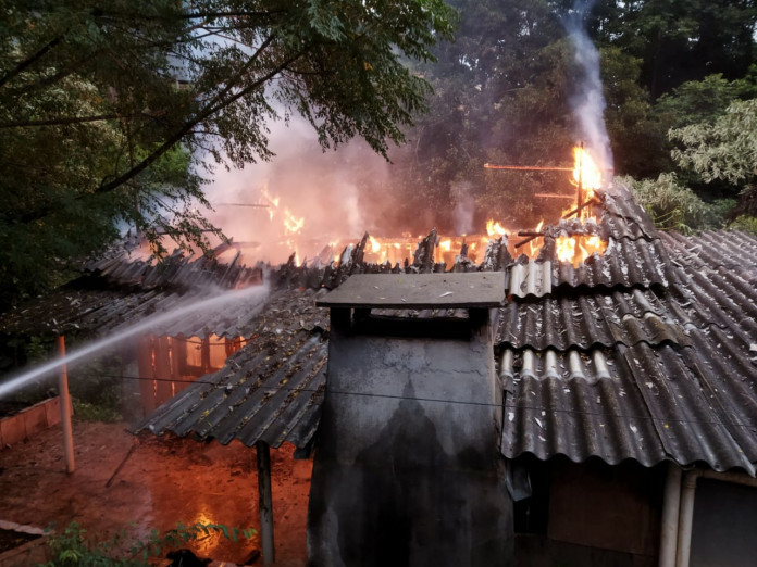 Os Bombeiros Voluntários foram acionados para controlar as chamas. A suspeita é de que andarilhos estavam morando no local e atearam fogo no imóvel.