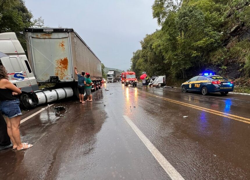 Segundo informações divulgadas, o fato envolve um carro e uma carreta, há duas vítimas feridas no local. No momento do acidente chovia bastante.
