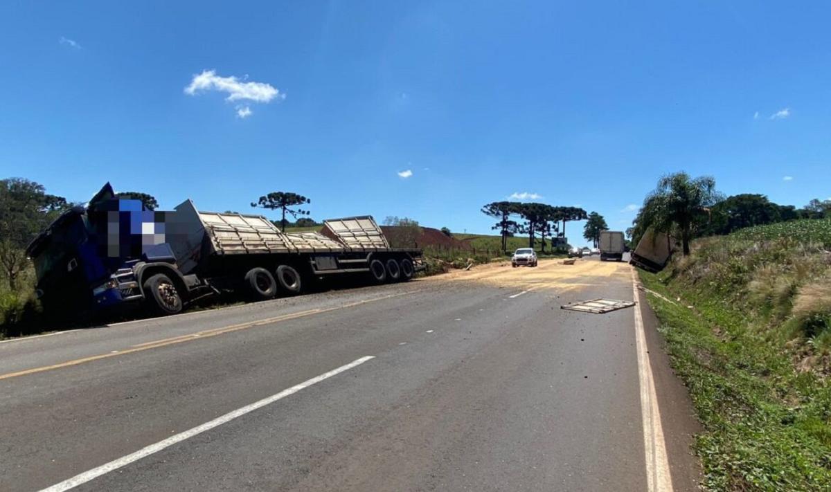 Ninguém ficou ferido. O trânsito está lento no local, devido a carga de soja ter caído sobre a pista.