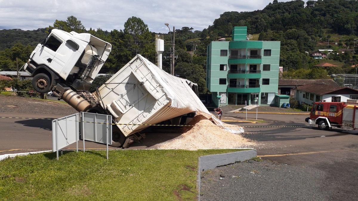 Uma carreta carregada com cerca de 30 toneladas de maravalha tombou em cima de um veículo de passeio na manhã desta quinta-feira, dia 9, no Centro de Rio das Antas, no Meio-Oeste de Santa Catarina.