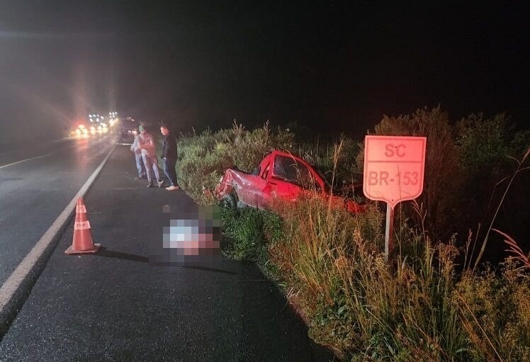 Um homem de 43 anos morreu após um grave acidente entre uma Fiat Strada e dois caminhões na noite desta quarta-feira (15), no Km 14 da BR-153, no trevo de acesso à sede do Município de Água Doce, no Oeste Catarinense, por volta das 19h16.