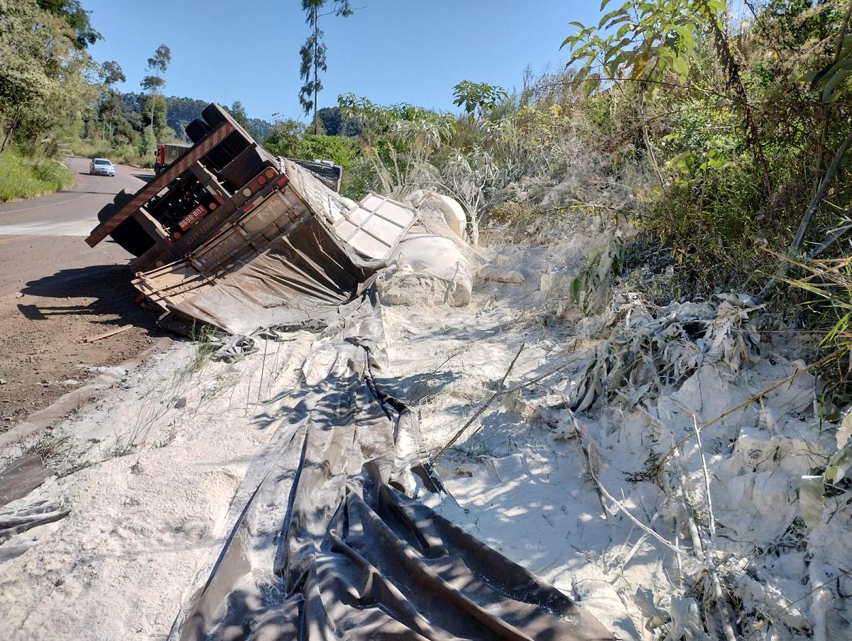 Uma carreta carregada com farinha, tombou na manhã desta segunda-feira, dia 03, na RSC 480, em São Valentim. O acidente aconteceu no km 41 da rodovia, conhecido como “Curva do Cagol”, um local que vem registrando vários acidentes graves nos últimos anos.