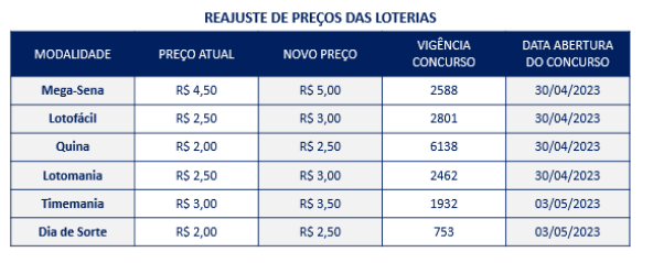As alterações entrarão em vigor a partir de 30 de abril para Lotofácil, Mega-Sena, Quina e Lotomania. A partir de 3 de maio, o reajuste passa a valer também para a Timemania e Dia de Sorte.