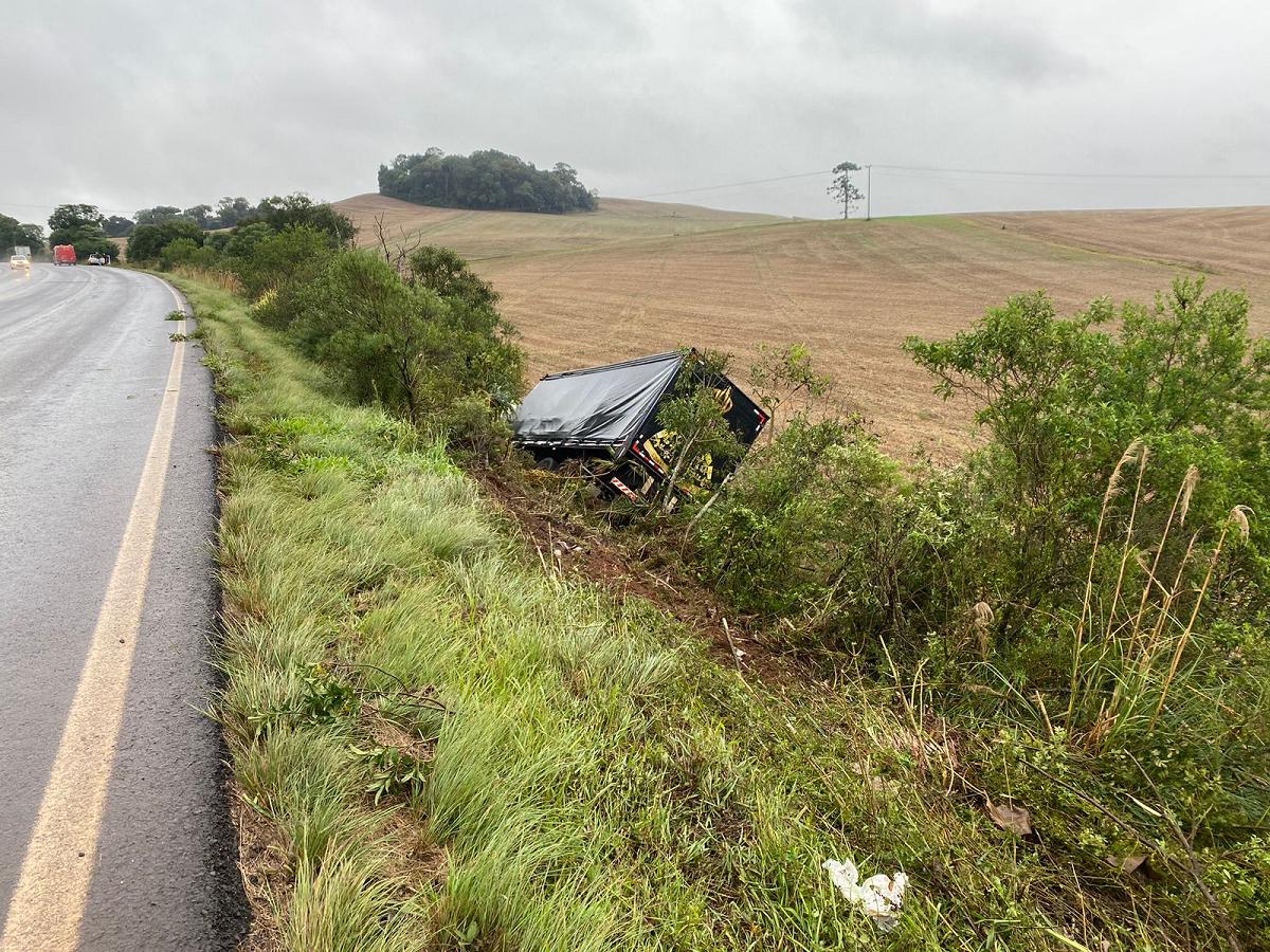 Um caminhão baú, que seguia no sentido Estação/Sertão, saiu da pista e caiu em um barranco de cerca de 8 metros na RS 135, na manhã desta quinta-feira, dia 4, em Estação.