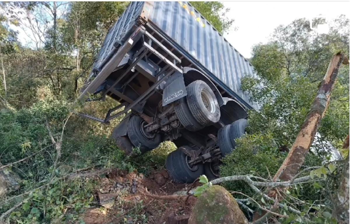Uma carreta de transporte de container saiu da pista na tarde desta quarta-feira (31), na BR 470 na descida da Serra do Rio Uruguai, em Barracão.