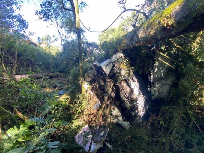 Com a força do impacto o caminhão tombou em um barranco e ficou completamente destruído.