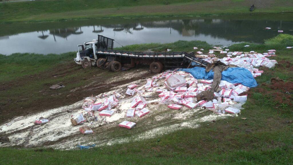 No local, um caminhão modelo Mercedes Benz, emplacado em Piracicaba (SP), carregado com farelos, saiu da pista, tombou quase caindo em um lago.