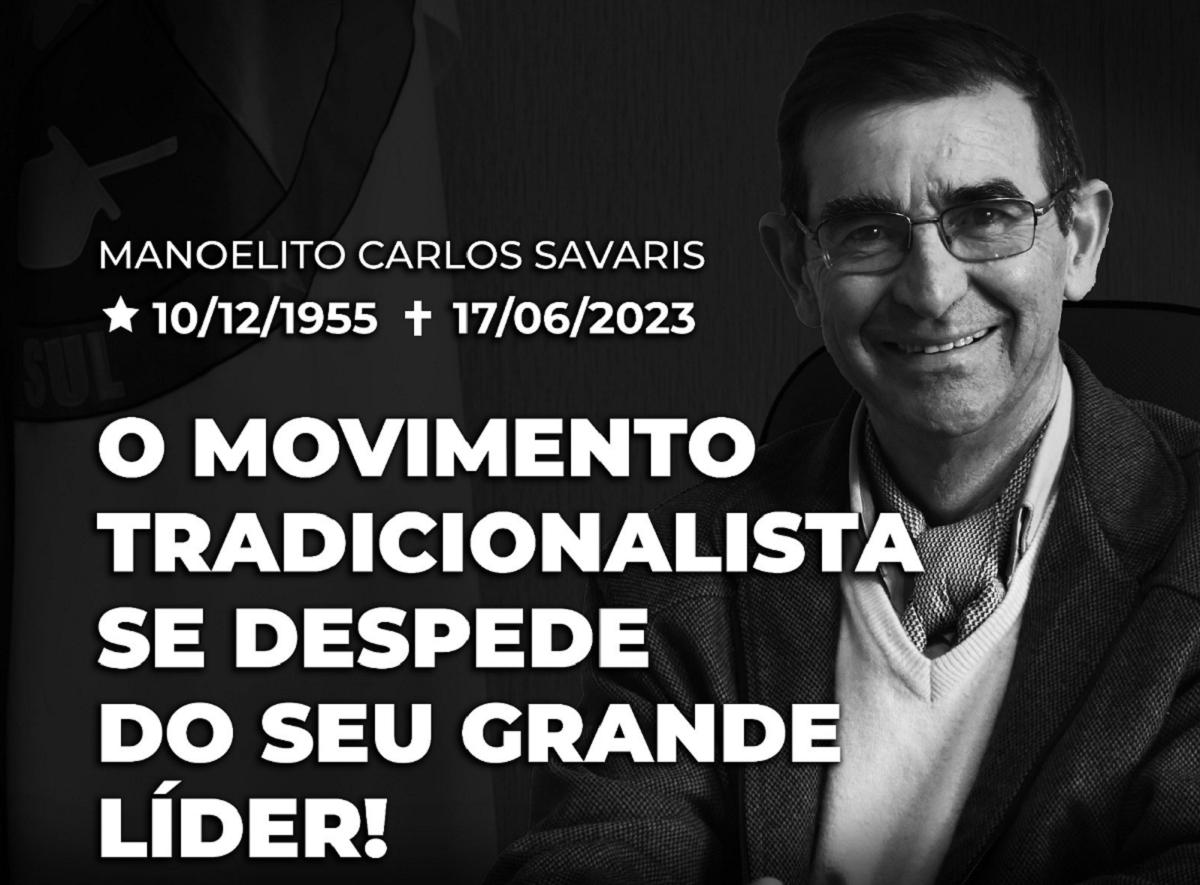 Faleceu na madrugada deste sábado, dia 17, aos 67 anos, o presidente do MTG, Manoelito Carlos Savaris. Natural de Casca/RS, mas aquerenciado em Caxias do Sul, Savaris era oficial da Reserva da Brigada Militar e bacharel em História. Estava à frente do Movimento Tradicionalista Gaúcho em seu 9º mandado (2001/2003 (3), 2005/2006(2), 2014/2015(2), 2021/2022(1) e 2023).