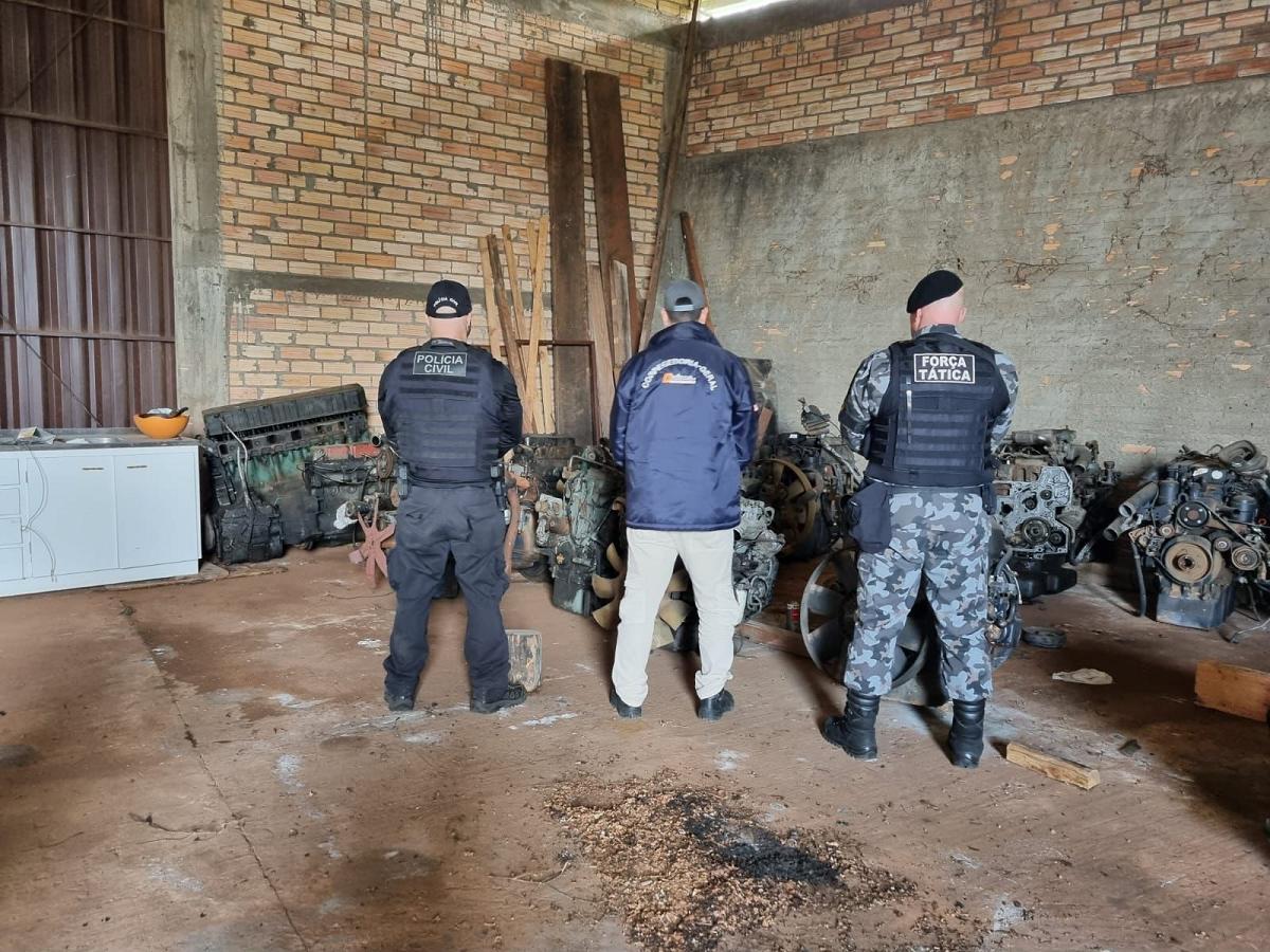 "Foram localizados e apreendidos dois motores, um com restrições judiciais e outro com numeração raspada/suprimida, além de dez caminhões, todos com restrições judiciais, e que, em tese, seriam destinados ao desmanche irregular. Além da apreensão de peças e veículos irregulares, em dois locais foi verificada a ocorrência de crimes ambientais." , destaca a nota enviada pelo delegado.
