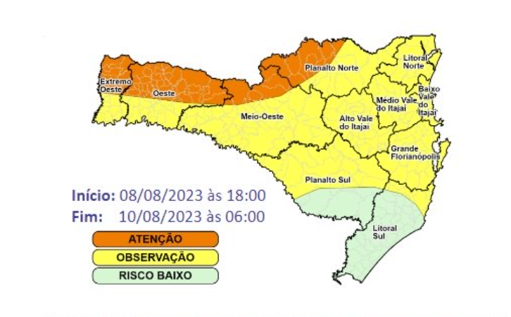 Os locais mais propícios, também conforme a Defesa Civil, são principalmente as regiões de divisa com o Paraná. Altos acumulados de chuva, acompanhados de vendavais, poderão ocorrer em curtos espaços de tempo.
