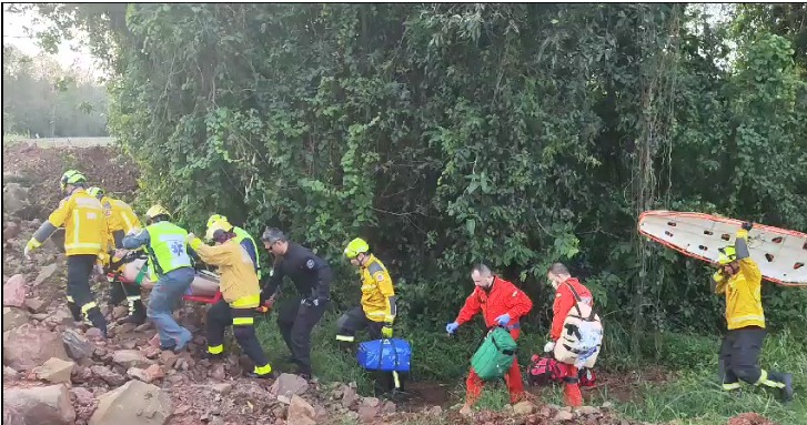 O resgate foi feito pelos bombeiros e o motociclista foi transportado de helicóptero do Saer/Sara (Serviço AeroPolicial de Fronteira/Serviço de Atendimento e Resgate Aeromédico) até o HRO (Hospital Regional do Oeste).