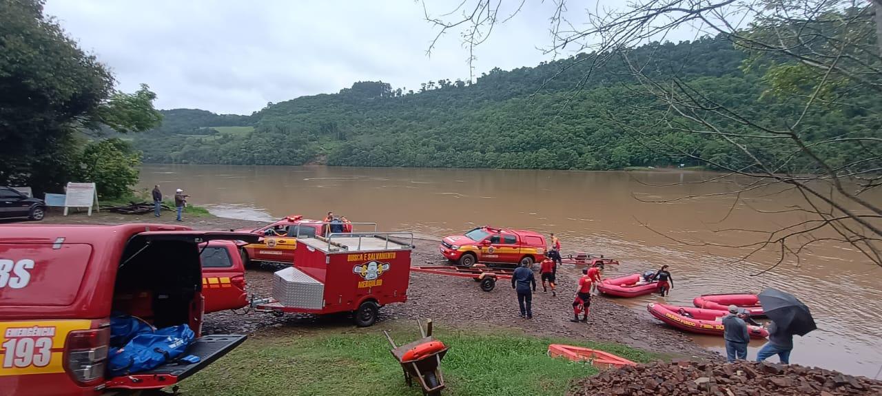 Equipes do Corpo de Bombeiros voltaram ao rio Uruguai, em Marcelino Ramos, logo no começo da manhã de hoje (19) para retomar as buscas pelo piloto que desapareceu quando a balsa que ele conduzia virou.