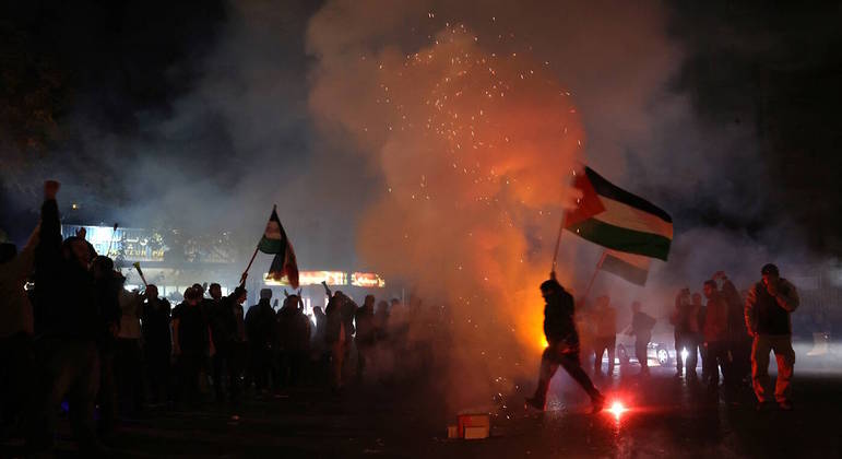 "Os Estados Unidos estão de alguma forma dirigindo o crime que está sendo cometido em Gaza", disse ele, sugerindo que as mãos dos americanos "estavam manchadas com o sangue dos oprimidos, de crianças, pacientes, mulheres e outros."