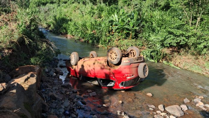 O automóvel Ecosport caiu dentro de um rio e ficou com rodado para cima.