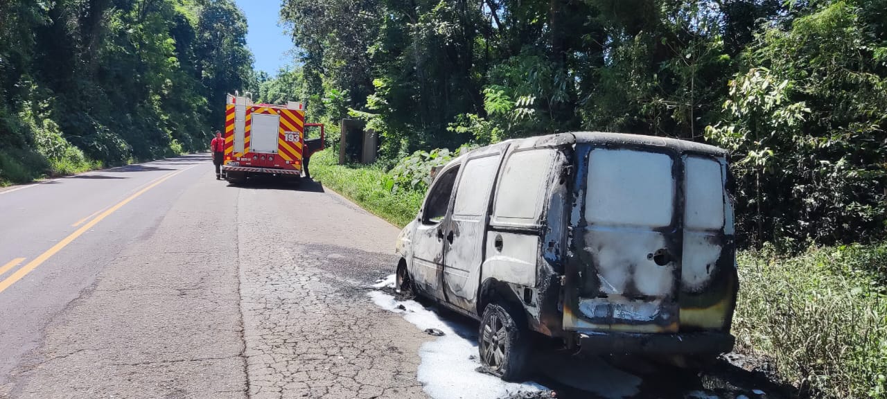 Corpo de Bombeiros de Piratuba foi acionado para atender a ocorrência e quando chegou no local um Fiat Doblô estava completamente tomado pelas chamas.