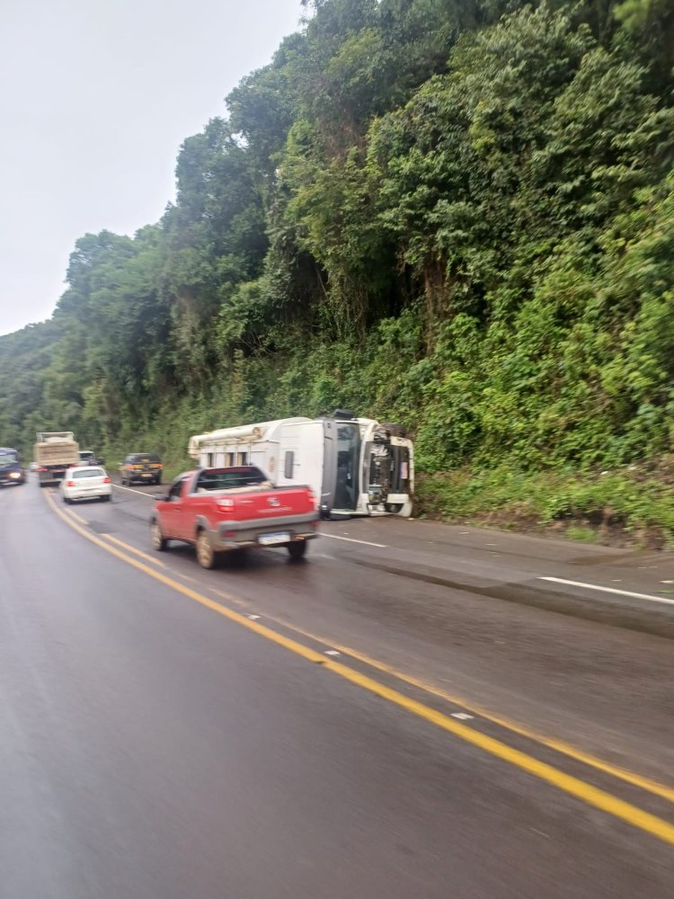 Dois veículos se envolveram em um acidente na manhã desta sexta-feira, dia 16, na BR-153, próximo ao posto da Polícia Rodoviária Federal de Concórdia. Segundo informações apuradas, foi uma colisão lateral entre uma caminhonete e um caminhão graneleiro que consequentemente acabou ficando tombado às margens da rodovia. A camionete devido à batida também saiu da pista.
