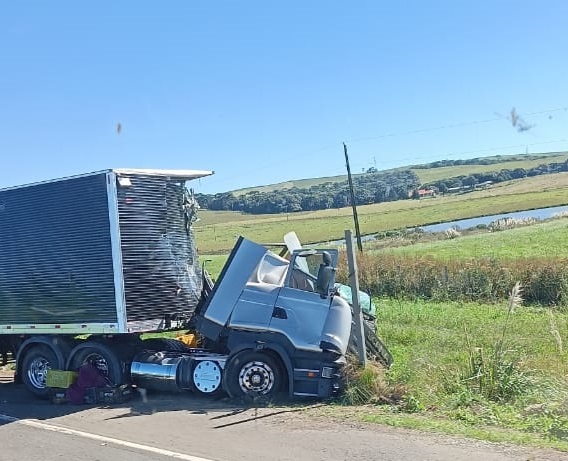 Uma carreta Scania de Concórdia se envolveu em uma violenta colisão, na tarde deste domingo (21), por volta das 14h. O acidente aconteceu na BR-153, na região do Horizonte.