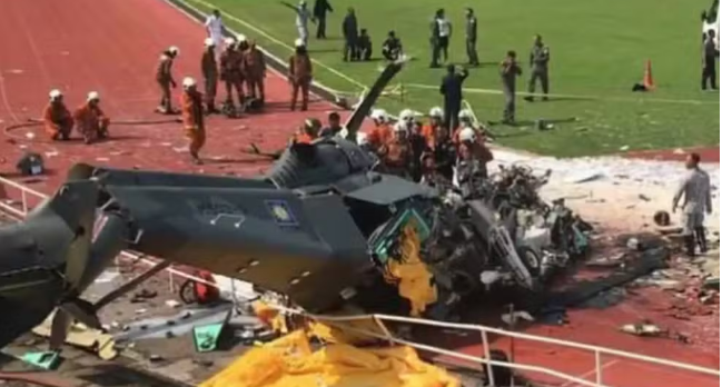 O governo informou que os helicópteros estavam fazendo um ensaio para um desfile da Marinha Real da Malásia. As aeronaves caíram em um complexo esportivo.
