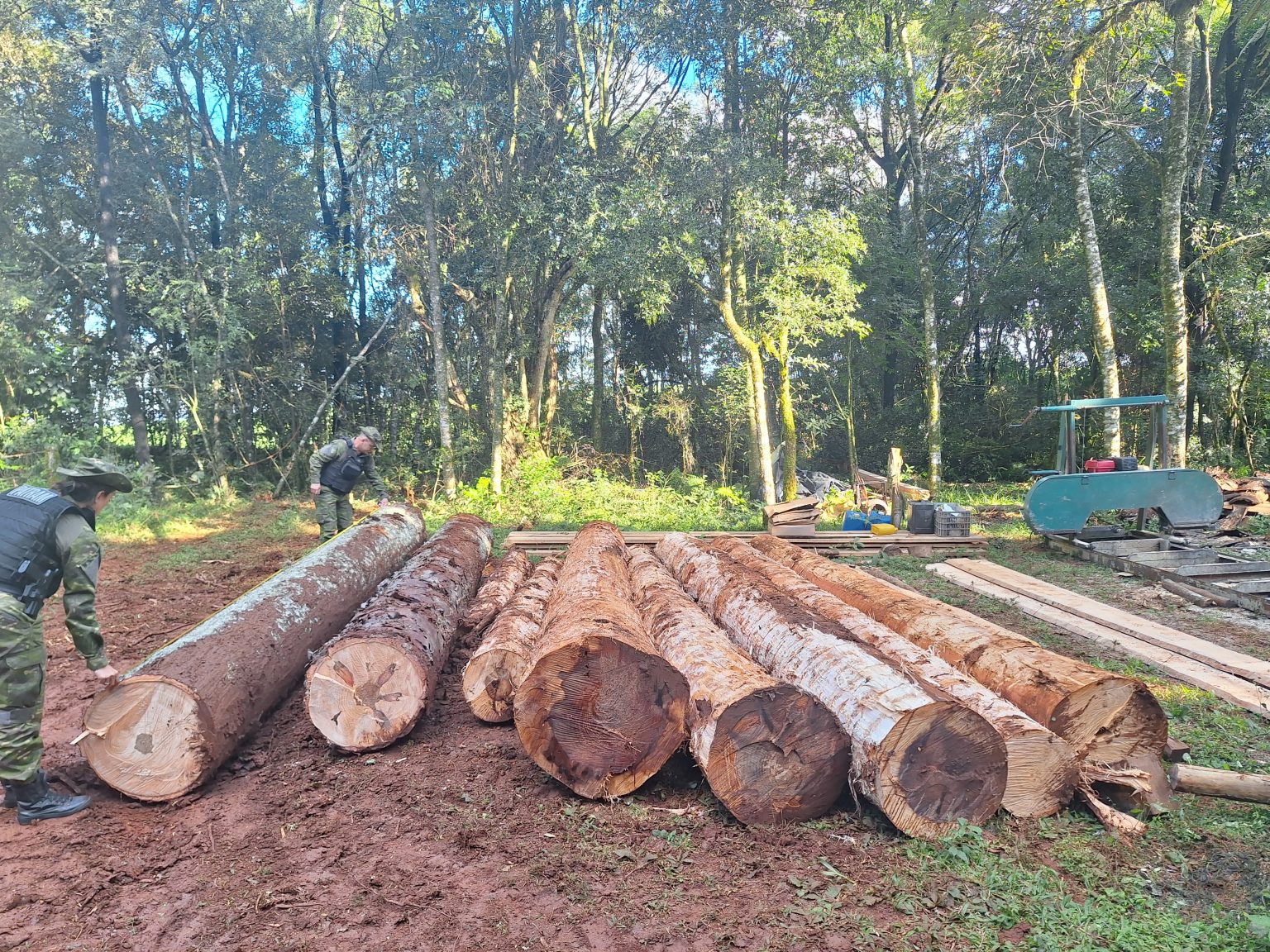 Os policiais encontraram um serraria móvel e várias Araucárias Angustifólias derrubadas, sendo que com as toras estavam sendo feitas tábuas de diversas medidas. Ao total, foram cortadas 14 araucárias, mas parte das madeiras não estavam no local.