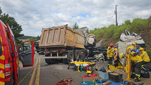 Duas pessoas morreram e uma ficou gravemente ferida na manhã desta quarta-feira (8) após uma colisão frontal entre uma carreta e um caminhão-caçamba na BR-282, em Campos Novos. A tragédia foi registrada por volta das 10h05min próximo a ponte do Rio Inferninho.