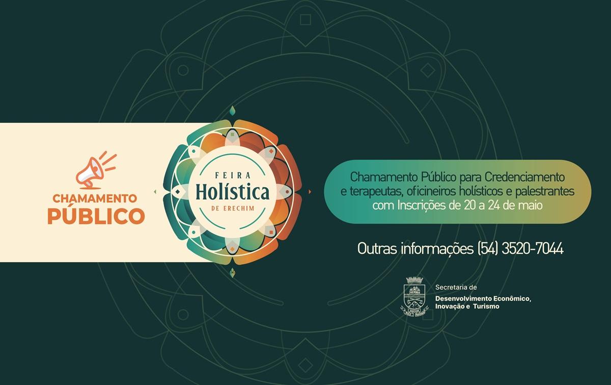A Prefeitura de Erechim, por meio da Secretaria Municipal de Desenvolvimento Econômico, Inovação e Turismo, informa que está aberto o credenciamento para terapeutas, oficineiros holísticos e palestrantes para integrarem a programação da 2ª Feira Holística de Erechim, que acontece nos dias 8 e 9 de junho, no Ginásio do Colégio Estadual Haidée Tedesco Reali.