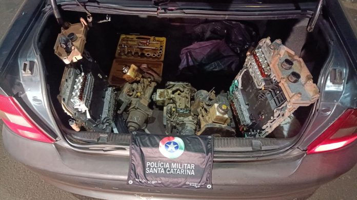 No veículo estavam três homens: o condutor, de 23 anos, e dois passageiros, de 24 e 18 anos. Durante a busca no veículo, foram encontrados no porta-malas três módulos servo de embreagem de caminhão da marca Scania, dois módulos de caixa de câmbio de caminhão da marca Volvo e duas caixas de ferramentas.