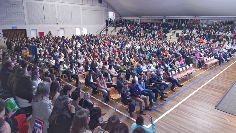 Mil e duzentos professores de 21 municípios do Alto Uruguai gaúcho e catarinense participaram na quinta-feira à noite, 18, no Salão de Eventos da URI, de mais uma etapa da capacitação promovida pela Universidade, em parceria com as prefeituras e o Sicredi UniEstados, por meio dos projetos União faz a Vida e Cooperativas Escolares.