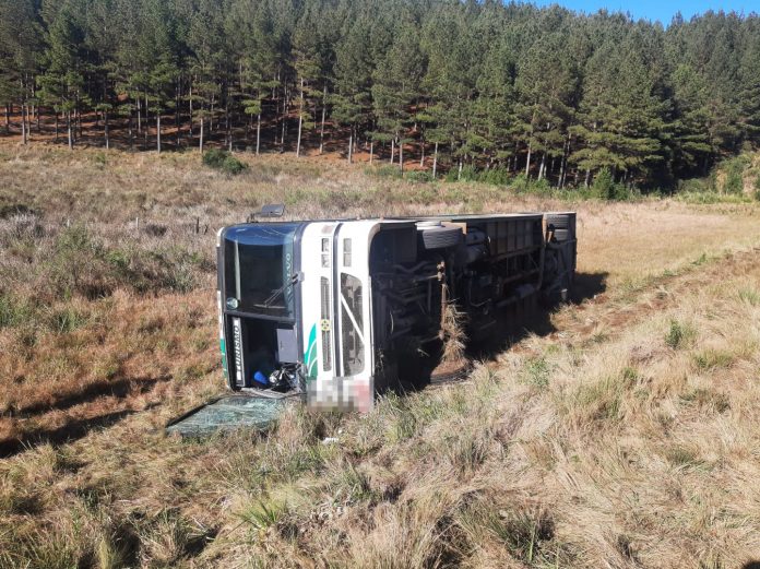 Um ônibus com placas da cidade de General Carneiro-PR, saiu da pista e capotou, levando as equipes de resgate a uma intensa operação de atendimento às vítimas.
