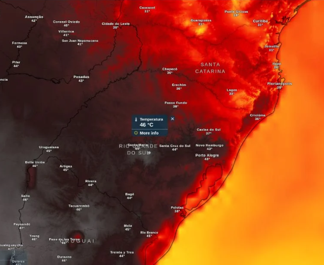 Na terça-feira, o calor extremo deve persistir, com temperaturas similares às registradas no dia anterior. Porto Alegre e regiões próximas podem registrar máximas ao redor de 40ºC, enquanto cidades do interior devem continuar enfrentando temperaturas entre 40ºC e 43ºC.
