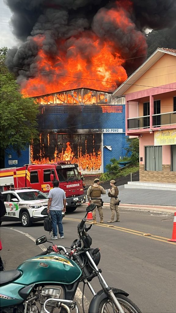 Um incêndio de grandes proporções atingiu, na manhã desta quarta-feira (2), o galpão de uma escola de samba Vale Samba na cidade de Joaçaba.