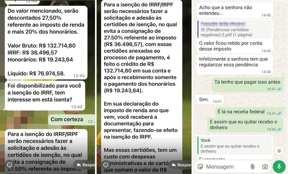 Em seguida encaminham uma foto do Fórum ou alguma repartição qualquer, dizendo que estão lá, solicitando que façam um pix para pagar custas, imposto de renda, IOF, ou outras taxas. Que precisam desses valores, para poder liberar o montante da causa. E muitas vezes nos dias seguintes, fazem a mesma coisa, solicitando novos valores, para que o dinheiro da ação seja liberado. As pessoas estão fazendo empréstimos para pagar os bandidos.
