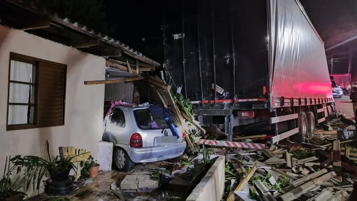 Por volta das 19h, um caminhão que estava estacionado acabou desandando, atingindo automóveis e colidindo contra duas residências.