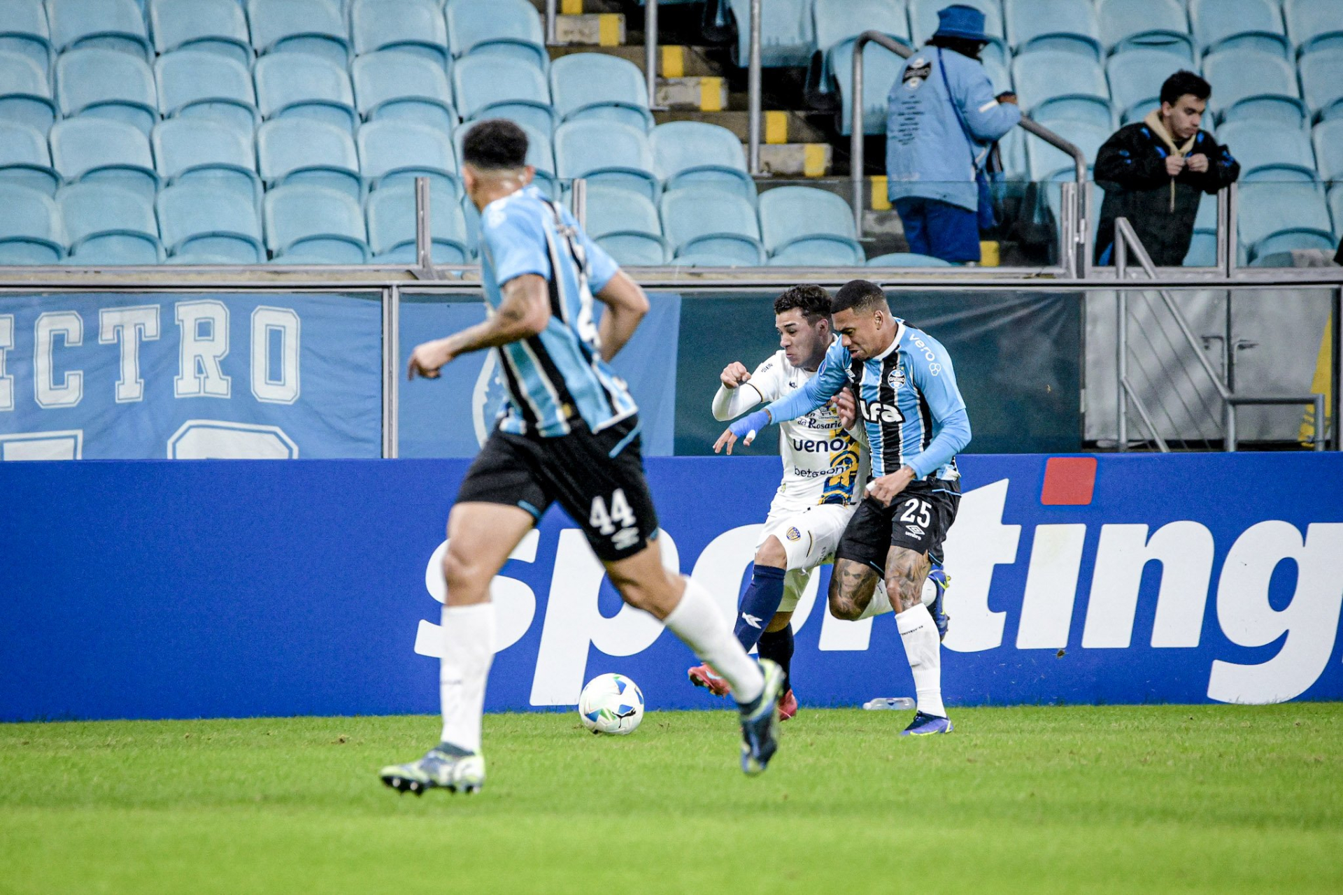 O Grêmio iniciou tentando manter a posse de bola, construir as jogadas a partir do campo de defesa e furar a defesa do adversário e aos 9’ em chute de Lucas Esteves, Arezo foi derrubado na área e após análise no VAR, o árbitro marcou pênalti. O próprio uruguaio foi para a cobrança, bateu mal e o goleiro ficou com a bola. Aos 26’, após escanteio, Gustavo Martins subiu para o cabeceio, mas o goleiro se antecipou e tirou de soco. Aos 37’, Elvio Vera chutou Nathan e foi expulso. Aos 47’, a bola sobrou para Lucas Esteves, que bateu bonito de fora da área, mas Mongelos fez ótima defesa. Aos 48’, Gustavo Martins cabeceou e o goleiro fez mais uma boa defesa.