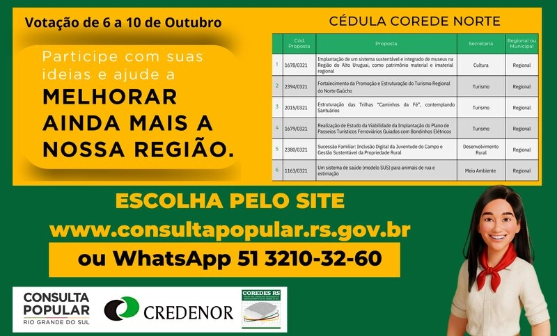 Começa na segunda-feira (6/10) a votação da Consulta Popular 2025. A população gaúcha poderá escolher até três propostas regionais para serem incluídas no orçamento estadual do próximo ano. A votação segue até a sexta-feira (10/10), de forma on-line ou por WhatsApp.