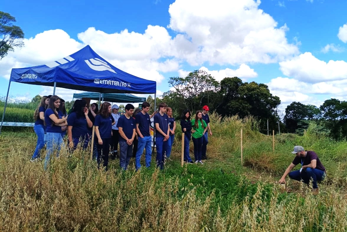 Na atividade, foi apresentado aos participantes o experimento conduzido pela equipe da Emater/RS-Ascar que avalia a interferência de diferentes tipos de palhadas — provenientes de espécies de cobertura como aveia-preta, azevém, ervilhaca e nabo forrageiro, além de uma área sem cobertura — sobre os índices de evaporação da água presente no solo.