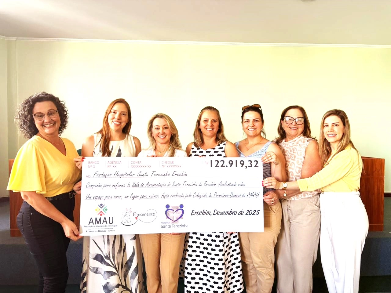 O colegiado das primeiras-damas da AMAU, comandado pela presidente Silvana Mafissoni, concluiu na sexta-feira, 5, a entrega dos valores arrecadados pelo Pedágio Solidário, campanha iniciada em setembro e que se estendeu por quase 90 dias nos municípios do Alto Uruguai. O recurso será destinado à reforma da sala de amamentação da Fundação Hospitalar Santa Terezinha em Erechim.